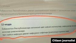 12- моддада "Ўзбекистон Республикасида ижтимоий ҳаёт сиёсий институтлар, мафкуралар ва фикрларнинг хилма-хиллиги асосида ривожланади. Ҳеч қайси мафкура давлат мафкураси сифатида ўрнатилиши мумкин эмас", дейилган.