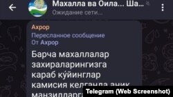 Озодликда мутасаддилар томонидан маҳалла фуқаролар йиғинларига Телеграм орқали жўнатилган топшириқнинг нусхаси мавжуд.