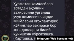 “Ҳурматли ҳамкасблар, эртадан аҳолининг захирасини ўрганиш учун комиссия чиқади. МФЙларини огоҳлантириб қўйинглар, захираси бор хонадонларни билиб қўйишсин, кўрсатишга. (картошка, пиёз, сабзи)”, дейилади Телеграмдаги ёзишмада.