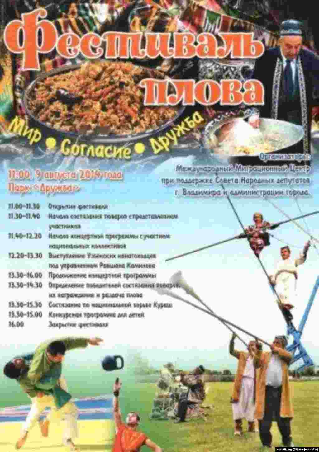2014 йил 9 август куни Россиянинг Владимир шаҳрида Палов фестивалида иштирок этган ошпаз-усталар 200 кг ош дамлашди. Тадбирдан тушган маблағ хайрия сифатида Владимир вилоятида паноҳ топган украиналик қочқин болачаларга сарфланди. Россиянинг турли шаҳарларида ўтказилиши анъанага айланиб бораётган Владимирдаги хайрия дастурида ўзбек дорбозлари ва санъат усталари иштирок этди.