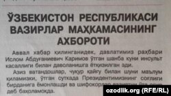 Ўзбекистон парламенти ва ҳукумати нашри “Халқ сўзи” газетаси 2 сентябрь кунги сонида инсульт касали билан даволанишга ётқизилган Президент Ислом Каримовнинг аҳволига доир расмий хабарни эълон қилди.