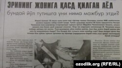 Жорий йил 20 август куни Фарғона вилояти Олтиариқ туманида яшовчи 60 ёшли аёл 67 яшар эрининг жонига қасд қилди (“Постда”, 1 сентябрь). Суриштирув жараёнида маълум бўлишича, марҳум эр спиртли ичимликларга муккасидан кетган бўлиб, қирқ йил бир ёстиққа бош қўйган рафиқасини маст ҳолда муттасил калтаклаб, хўрлаб келган. Қариб қуйилмаган қария хурмача қилиқлари билан маҳаллада ҳам отнинг қашқасидек ҳаммага маълум бўлган. Қотиллик рўй бергани куни ҳам муштумзўр эр бўкиб спиртли ичимлик ичгач, кампирини роса калтаклаган, кейин уни маънан эзиб, ғайритабиий усулда жинсий яқинлик қилишга мажбурлаган. Бу хўрликларга чидолмаган аёл ухлаб қолган эрини лом билан уриб ўлдирган.