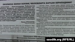 Ўзбекистон Ички ишлар вазирлиги расмий нашрида Тошкент шаҳри ва вилоятидаги прописка тизими Конституцияга зид экани қайд этилди (“Постда”, 2 июнь). Хусусан, тошкентлик Мурод Эрназаров прописка тизими Конституциядаги фуқароларнинг исталган ҳудудда яшаш ҳуқуқига зид эканини таъкидлаб, вазирлик расмийларидан доимий пропискага оид чекловлар қачон йўқотилишини сўраган. ИИВ Миграция ва фуқароликни расмийлаштириш бош бошқармаси бошлиғи ўринбосари, полковник Ф.Турсунов ушбу саволга жавоб бераркан, прописка тизими Конституцияга зид экани ҳақидаги фикрни рад этмаган. Миграция расмийсига кўра, Тошкент шаҳри ва вилоятидаги доимий пропискага эга бўлмаган фуқаролар учун иккиламчи бозордан кўчмас мулк сотиб олишга бўлган чекловларни бекор қилиш режалаштирилмоқда. Вазирлик расмийси прописка тизими бутунлай бекор қилиниши масаласига тўхталмаган.