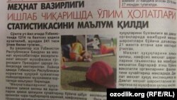 Сўнгги уч йил ичида Ўзбекистонда ишлаб чиқариш пайти 1214 та бахтсиз ҳодиса кузатилиб, шундан 241 таси ўлим билан тугади (“Даракчи”, 5 июль). Бу ҳақда Бандлик ва меҳнат муносабатлари вазирлиги маълумот берган. Фуқаролар меҳнат ҳуқуқлари бузилиши ва давлат органларида мажбурий меҳнат шароити бўйича 21 мингдан зиёд даъво билан чиққан. Айни пайтда меҳнаткашларнинг ҳуқуқларини ҳимоя қилиш ва уларнинг хавфсизлигини сақлаш чораларини кучайтириш талаб этилмоқда. Хусусан, икки тузилма – Давлат меҳнат ҳуқуқ ва Давлат меҳнат шароитларини экспертиза ва муҳофаза қилиш инспекцияларини бирлаштириб, ягона Меҳнат инспекциясига айлантириш таклиф этилмоқда.