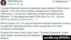 Таниқли иқтисодчи Юлий Юсупов Гулнора Каримова томонидан Ўзбекистонга қайтарилгани иддао қилинган 1,2 миллиард доллар маблағ бюджетга кирим қилинган-қилинмагани масаласига эътибор қаратиб, бу борада расмий тушунтириш сўради. “Давлат бюджетининг даромадлар тўғрисидаги қайси моддасига кўра бу каби киримлар амалга оширилмоқда? Негадир шу каби моддалар ва бюджетдаги тегишли суммаларни эслай олмадим”, деб ёзди Ю. Юсупов. Амалдаги солиқ сиёсатини танқидий баҳолаб келаётган мутахассис вазиятдан фойдаланиб масъулларни қўшилган қиймат солиғи миқдорини пасайтиришга ундаган. “Балки мана шу киримлар ҚҚСни 20 фоиздан 12 фоизга туширишга етар ва солиқ ислоҳотидаги асосий муаммони ҳал этишга ёрдам берар? Отасининг солиқ сиёсатида йўл қўйган хатоси қизининг пуллари эвазига тўғриланса, ёмон эмас-ку”, деб ёзган у.
