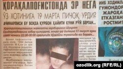Қорақалпоғистон Республикаси Хўжайли туманида яшовчи эркак хотинини шафқатсизларча ўлдирди (“Даракчи”, 29 август). Қайд этилишича, воқеа 11 август – Қурбони ҳайити куни рўй берган. Исми ошкор этилмаган эркак аёли билан жанжаллашиб қолади. Ғазабга минган эр хотини ухлаб ётган пайтда унга 19 маротаба пичоқ билан зарба беради. Аёл Хўжайли туман касалхонасида вафот этади. Қотилликда айбланаётган эрга нисбатан Жиноят кодексининг 97-моддаси бўйича иш очилган. Терговни Қорақалпоғистон Республикаси прокуратураси назоратга олган. Қайд этилишича, ушбу оиланинг 4 ва 1 ёшли қизлари бор. Улар ҳозирда марҳума туғилиб ўсган уйда. Икки қизалоқ онасига нима бўлганидан бехабар.