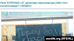 Korzinka.uz супермаркетлар тармоғи Ўзбекистон Республикасининг “Давлат тили ҳақида”ги қонунини бузмоқда (www.uza.uz, 6 cентябрь).