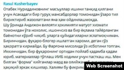 Олий Мажлис Қонунчилик палатаси депутати Расул Кушербоев Андижон вилояти Асака туманида блогер Отабек Нуриддиновнинг қамалганини танқидий баҳолади. “Отабек Нуриддиновнинг масъуллар ишини танқид қилгани учун Асакадаги бир гуруҳ мансабдорлар ўзаро тил бириктириб жазолатгани яна ҳам ойдинлашмоқда”, деб ёзди депутат Телеграмдаги шахсий саҳифасида. Қайд этилишича, блогер яшин тезлигида жазолангани бу буюртма деган шубҳани кучайтиради. Депутат бу ҳолатни “фуқаролик жамиятини ривожлантириш йўлида жуда ёмон сигнал”, деб атаган.