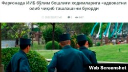 Фарғона шаҳри ИИБ бўлим бошлиғи адвокат Дилмурод Мадраҳимовга ҳимояси остидаги шахс билан кўришишга рухсат бермай, уни ҳайдаб чиқарди (www.xabar.uz, 25 февраль).