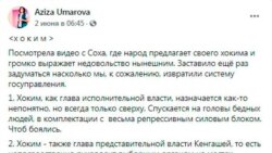 “So‘xda xalq hozirgi hokimdan norozi bo‘lib, o‘zlarining nomzodini taklif qilayotgan videoni ko‘rdim. Ko‘rdimu biz davlat boshqaruvi tizimini rasvosini chiqarib yuborganimizga yana bir marta amin bo‘ldim” , - deb yozadi davlat boshqaruvi bo‘yicha mutaxassis Aziza Umarova.