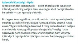 Ta’kidlanishicha, O‘zbekiston kambag‘allikni qisqaritish uchun alohida dasturlar o‘ylab chiqishi shart emas, asosiy urg‘u iqtisodiy o‘sishga qaratilsa bas.