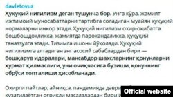 Davletov.uz Telegram kanali muallifi, bloger Qobiljon Xidirov pandemiya davrida O‘zbekistonda huquqiy nigilizm kuchayganidan xavotir bildirdi.