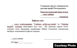 “Fakultet talabalari “Yoshlarni qo'llab-quvvatlash” va “Talabalar harakati” telegram kanallariga a’zo emas. Shu kanallar orqali to‘lov-kontrakt puli miqdorini kamaytirish bo‘yicha o‘tkazilgan so‘rovnomada ishtirok etmaganligiga kafolat beraman”, deyiladi tilxat nusxasida.
