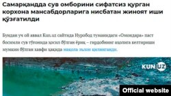 Samarqand viloyati Nurobod tumanidagi “Omondara” past bosimli suv to‘g‘oni qurilishida kamchiliklarga yo‘l qo‘ygan mansabdorlarga jinoyat ishi ochildi (www.kun.uz, 18 avgust).