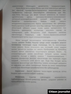 - Bosh prokuraturadan viloyat prokuraturasiga o‘rganish uchun ishchi guruhi kelgan. Bizdan kerakli hujjatlarni so‘raganda¸ hamma deputatlar haqiqatan qo‘l qo‘yganini tasdiqlab¸ noqonuniy berilib ketgan yerlar¸ fuqarolarning muammolari yechilmagani bo‘yicha¸ tumandagi barcha jabhalarda prezident siyosatiga bo‘layotgan qarshi ishlarga munosabat bildirilgan arizamizni odilona o‘rganishni so‘radik.