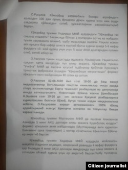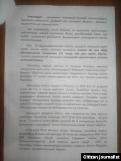 Maktubda hokim Otabek Rasulovga qo‘yilgan bu ayblovlarni tasdiqlashi aytilgan qator misollar keltirilgan.
