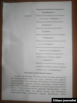 Maktubning so‘nggi sahifasida xalq vakillari prezidentdan tuman hokimi va unga bo‘ysunuvchi idora rahbarlarining noqonuniy hatti-harakatlarini tekshirib chiqish uchun respublika maxsus ishchi guruhi tuzish va unga o‘zlarini ham jalb qilishni so‘ragan.