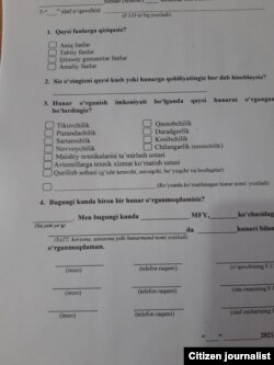 Нусҳаси Озодликка юборилган сўровнома матнидан унга 7-11 синф ўқувчилари¸ улар ота-оналари ва синф раҳбари қўл қўйиши шартлиги кўрилади. Сўровномада ўқувчилардан “ҳунар ўрганиш имкони бўлганда¸ қайси ҳунарни танлаган бўлардингиз” деб сўралган ва танлаш учун 11 та касб таклиф этилган.