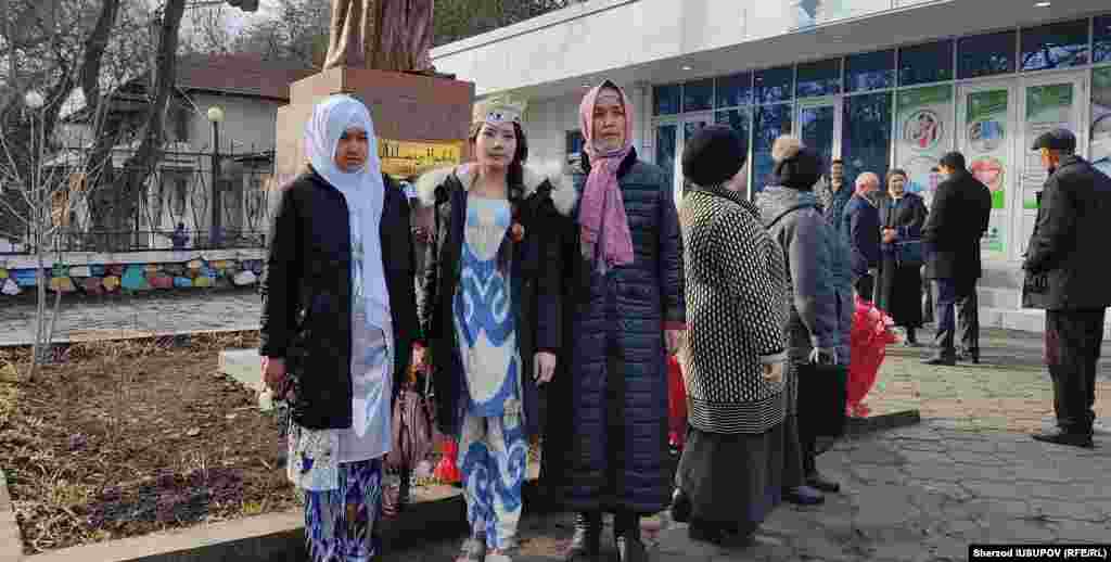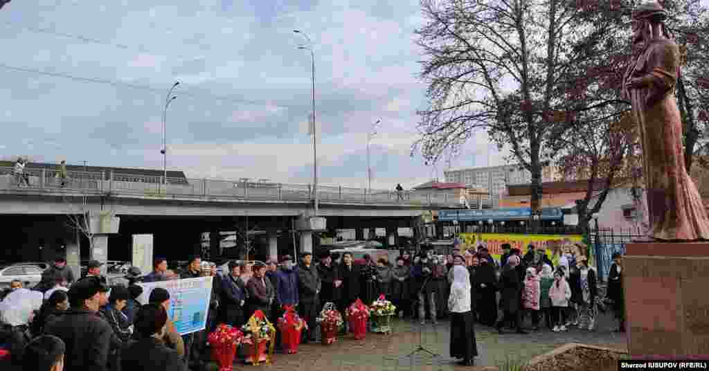 9 февраль куни Ўш шаҳри марказидаги Навоий номидаги истироҳат боғи кираверишида жойлашган Навоий ҳайкали ёнида адабиёт муҳлислари, расмийлар ҳамда мактаб ўқувчиларидан иборат юзга яқин одам йиғилди.