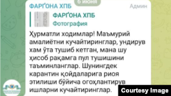 "Ҳурматли раҳбарлар! Бугун душанба куни, яъни ҳафтанинг биринчи куни, барчамиз яхши ният қилиб ишни бошлашимиз керак. Биринчи масала барчангиз кеч соат 19:00 га туман-шаҳар СЭС, жойлардаги қўриқлаш, Маҳалла ва солиқ идоралари ходимларини жалб қилиб катта развод ўтказиб, телевидение жалб қилиб, Комиссиянинг 74-сонли баёнининг ижросини таъминлашингиз лозим, 20:30 да ёпилмаган жойларнинг маъмуриятига 54-2 модда билан баённома тузлишини таъминланг. Иккинчи масала маъмурий амалиётни кучайтиринг ва албатта ундирувни кучайтиринг. Ундирув бугунги кунда асосий масаладан бири", дейилади Озодликка ИИВ собиқ инспектори Нозимжон Нишонов тақдим қилган скриншотлардан бирида.