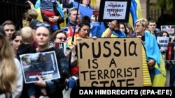 Украина байроқлари ва плакатларни кўтарган 100 га яқин одамлар шаҳар кўчалари бўйлаб “Россия-террорчи давлат” деб юриб ўтган.