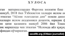 Экспертлар гуруҳи аъзоларидан бири Озодлик саволларига жавобан вилоят бош имом-хатиби Салим қори Қодировнинг “Аёлни эъзозлаган дин” китоби экспертизасида қатнашганини, экспертлар гуруҳи 5 кишидан иборат бўлганини, прокуратурага топширилган ҳужжат 2 варақдан иборат эканлигини ҳамда хулоса мазмунини тасдиқлади.