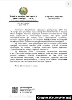Мамлакатдаги барча вазирлик ва идоралар раҳбарларига юборилган Бош прокуратура мактубида 18 декабрга қадар бу жараëнга оид ҳисоботни тақдим этиш сўралган.