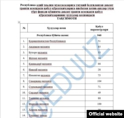 Олий ва ўрта махсус таълим вазирлиги хабарига кўра, хотин-қизлар учун тўрт фоизли қўшимча давлат гранти асосидаги қабул кўрсаткичларининг ҳудудлар кесимидаги тақсимоти тасдиқланган.