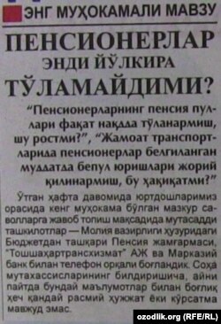 Расмий идоралар ўзбекистонлик пенсионерларга жамоат транспортида текин юриш ҳуқуқи берилиши ҳақидаги хабарларни рад этди (“Даракчи”, 12 январь). Ўтган ҳафта давомида, шунингдек, пенсионерларнинг пенсияси фақат нақд пулда тўланаркан, деган овозалар тарқалган. Молия вазирлиги ҳузуридаги Бюджетдан ташқари пенсия жамғармаси, “Тошшаҳартрансхизмат” акциядорлик жамияти ва Марказий банк бундай хабарларга оид расмий ҳужжат ёки кўрсатма мавжуд эмаслигини билдирган.