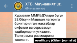 ИЗБОСКАН. “Андижон вилоят, Избоскан туманидан ёзмоқдаман. Тумандаги мактаблардан бирида ишлайман. Куни кеча “Сиздан Телеграм”да Избоскандаги педагоглар меҳнат таътилидан турли мажлисларга чақириб олинаётгани ҳақида мактуб чоп этилди. Мактуб муаллифи ҳақиқатни ёзибди. Чиндан ҳам, туман ХТБ мудири С.Ғ. турли баҳона ва арзимаган гап-сўзлар билан йиғилиш ўтказишни яхши кўради. Бугун директор, эртага “завуч”, индинга директор ўринбосарларини йиғиб топшириқ беришдан чарчамайди.