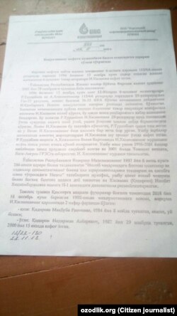ТОШЛОҚ. “Мен – Маҳбуба Қодирова, Фарғона вилояти Тошлоқ туманидан ёзмоқдаман. Онам Ижобатхон Ҳасанова Фарғона нефтни қайта ишлаш заводида ишлар эди. 1996 йил 12 ноябрда иш вақтида йўқолиб қолган. Ўшанда акам – 14, мен 12 ёшда эдик. Завод бизга ҳеч қандай ёрдам бермади. Ака-сингил жуда қийналиб яшадик. 2000 йилда уйимиз ёниб кетиб акам касалхонага тушди. Заводга мурожаат қилдим, лекин ёрдам беришмади. Акам 5 ой касалхонада ётиб вафот этди.