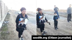 Кўксида президент портрети, ўнг қўлида телефон, сўл қўлида болта кўтариб олган ёш аёл “иккита боласи билан кўчада қолиб кетганини” айтар экан, “мен жойимни ҳеч кимга бермайман” дейди.